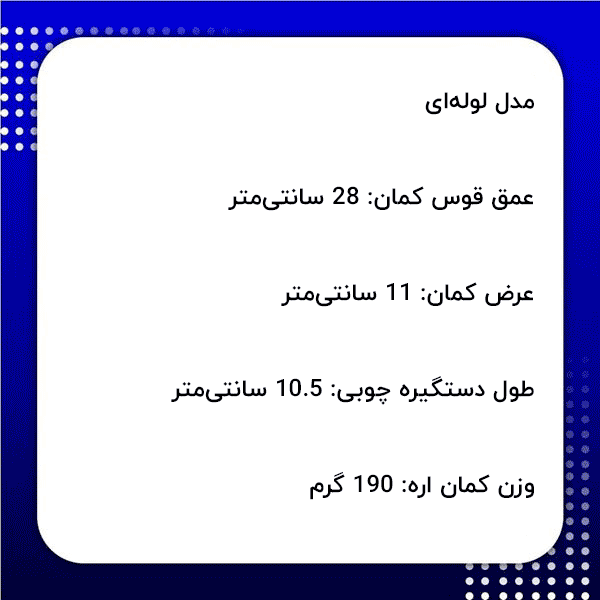 کمان اره مویی ساخت ایران میباشد که قسمت U شکل آن از فلز مقاوم و رنگ شده ساخته شده است. همچنین قابل ذکر است که دارای دستگیره مستحکم چوبی جهت حرکت روان میباشد. کمان اره مویی از دو پیچ خروسی که گاهی به پیچ خروسک نیز خوانده میشوند به همراه دو بست برای محکم کردن اره مویی استفاده میکند. این کمان اره مویی لولهای در با رنگ مشکی تولید شده است که دارای مشخصات فنی به شرح زیر میباشند: