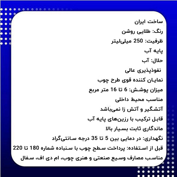 نسبتا غلیظ و با صرفه . طلایی تیره س اگر چوب خوب ساب ریز نخورده باشه به خورد چوب میره قهوه ای نشون میده