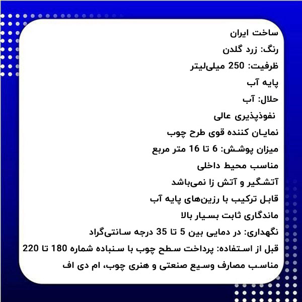 جوهر آستری ویناتو درخشندگی و نفوذپذیری بسیار بالایی روی چوب دارد. این جوهر علاوه بر ویژگیهای برجسته ذکر شده از مشخصات زیر برخوردار میباشد: