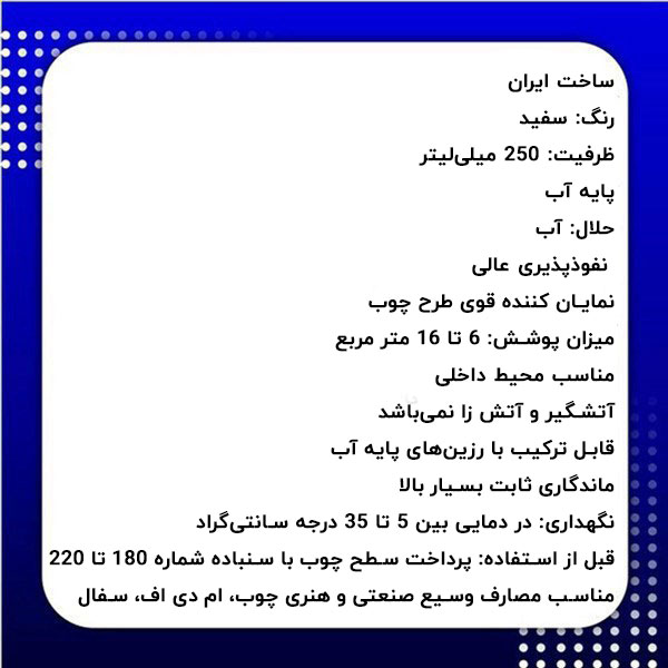 - نگهداری: در دمایی بین 5 تا 35 درجه سانتیگراد