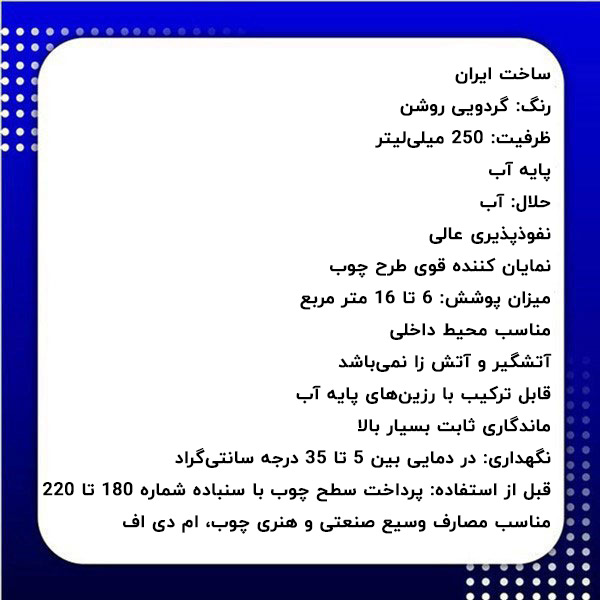جوهر آستری ویناتو درخشندگی و نفوذپذیری بسیار بالایی روی چوب دارد. این جوهر علاوه بر ویژگیهای برجسته ذکر شده از مشخصات زیر برخوردار میباشد: