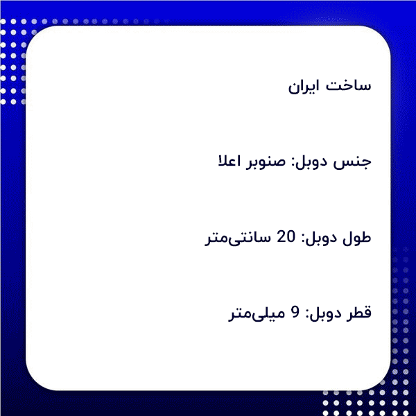 همانطور که ذکر شد قطر دوبل شاخه ای بدون شیار 9 میلی متر و طول آن 20 سانتی متر می باشد. نکته قابل ذکر درباره ی دوبل شاخه ای بدون شیار سطح صاف، صیقلی و بدون تاب بودن و کیفیت بالای آن می باشد که از جنس صنوبر اعلا تولید شده است. دوبل های چوبی وزن بالایی را نسبت به فیزیک ساختاری خود تحمل می کنند.